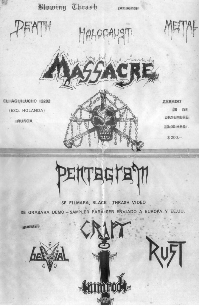 La banda MASSACRE guiados por su guitarrista fundador Yanko Tolic al ver la frustración de No Lograr terminar sus presentaciones en los eventos en los que se presentaban, decide junto a otros amigos crear su propia recital «Tocata», en las que invitan a participar a otras agrupaciones juveniles, algunas integradas solo por adolescentes, incluso conformadas en el momento por no haber otras que pudiesen participar. La historia cuenta que Pentagram debutó para la ocasión al igual que Nimrod que fue formada en ese instánte por Chris Irarrázaval quién se mantiene en la banda hasta hoy como su guitarrista, y que venía en aquella época, retornando a Chile tras varios años en el extranjero, junto a Yerko Tolic (hermano de Yanko de Massacre) , Eduardo «Picoroco» Navarrete y a Andrés «Chancho Cabrío» Marchant (en 1986 forma Necrosis junto a Yerko) se reunían tras los ensayos de Massacre quiénes les prestaban sus instrumentos y equipos para que prepararan lo que seria su arsenal para ese día, mientras desde la Ciudad puerto de Valparaíso se alistaba para su debut la banda Belial, considerada pionera del estilo death-Grind y que participo con un integrante menos.